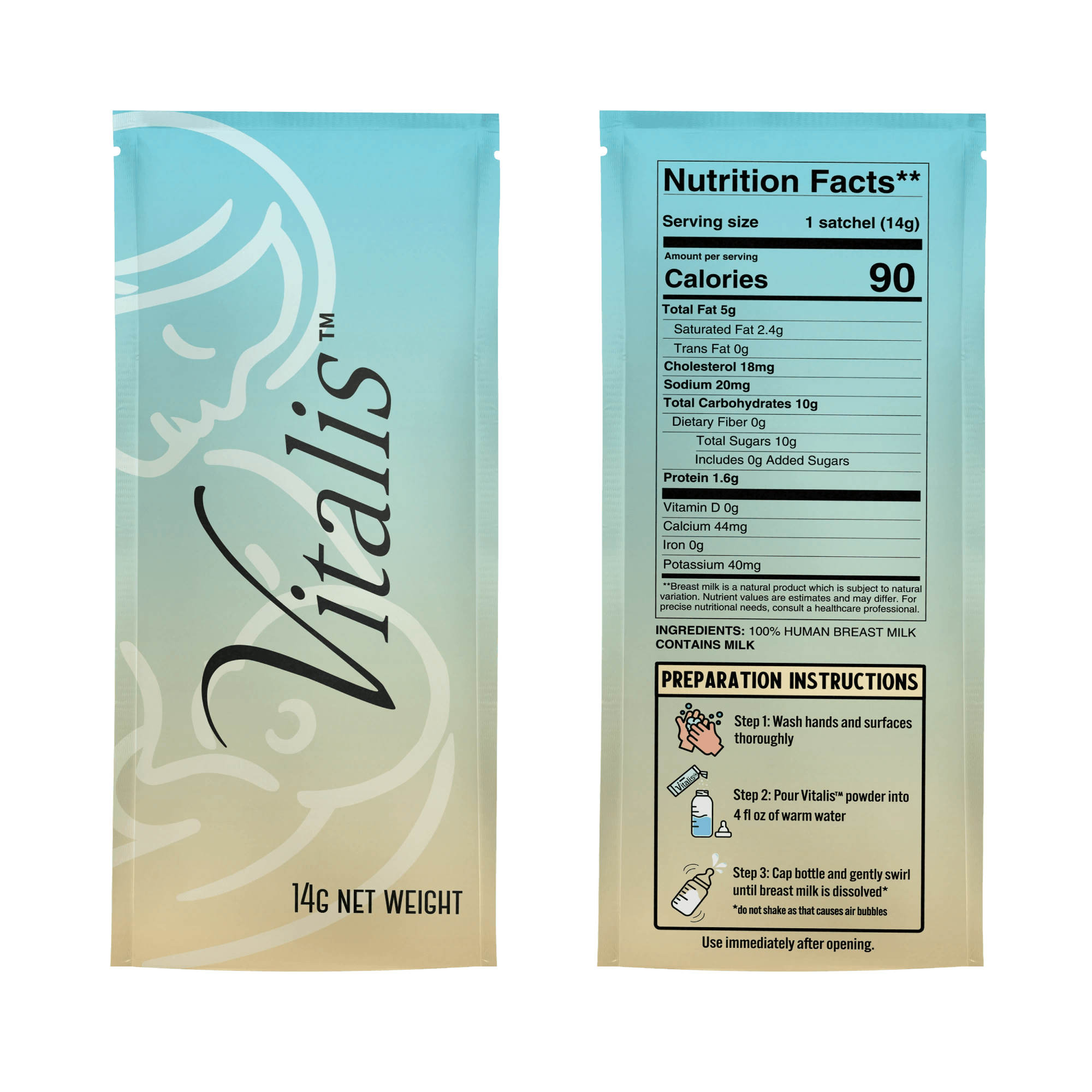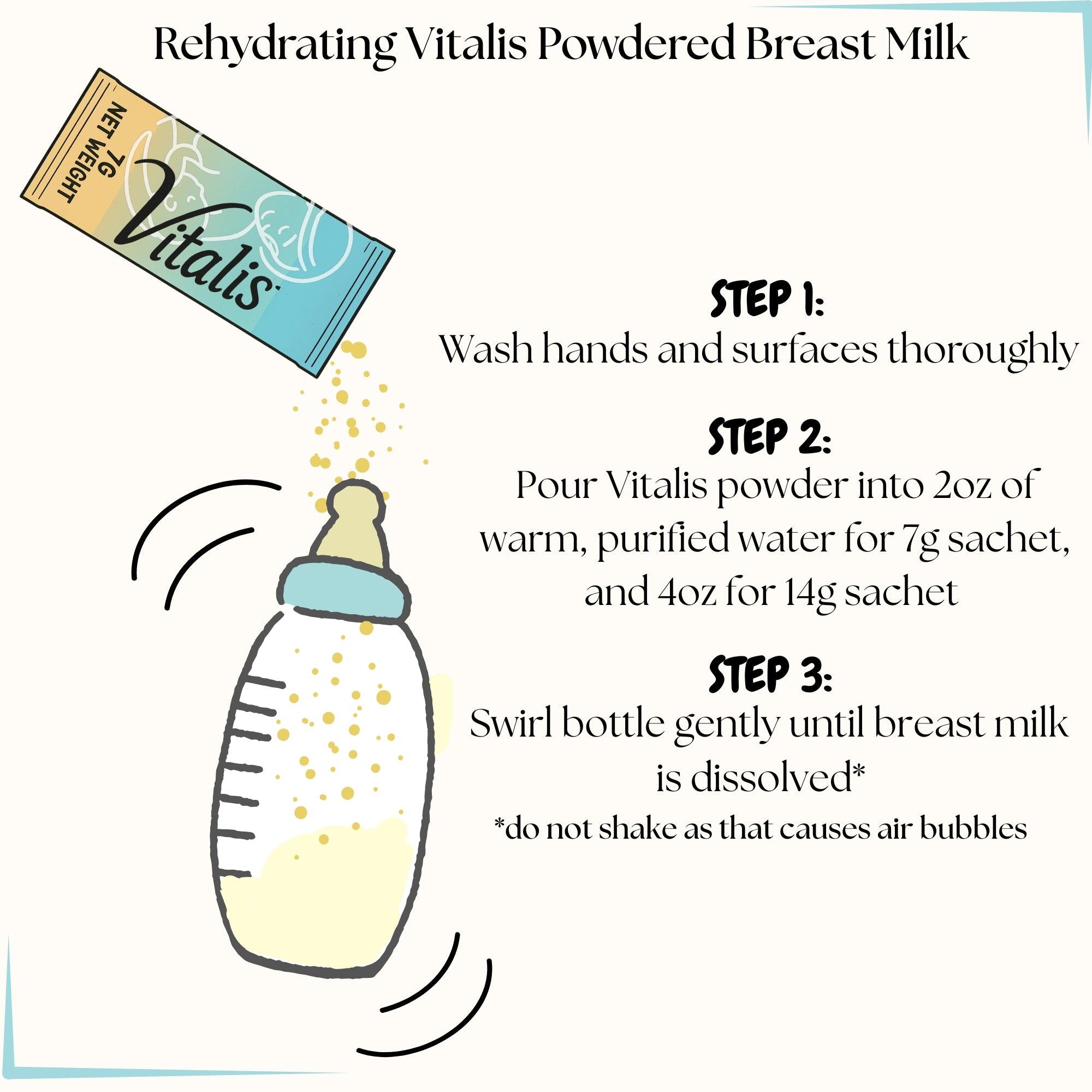 Pure, shelf-stable, donor breast milk with just the tear of a pouch! Vitalis offers the only available freeze-dried donor breast milk in the United States. Made entirely from screened and triple-tested donor milk - at ~$4-5/ounce, a price point lower than most milk banks.